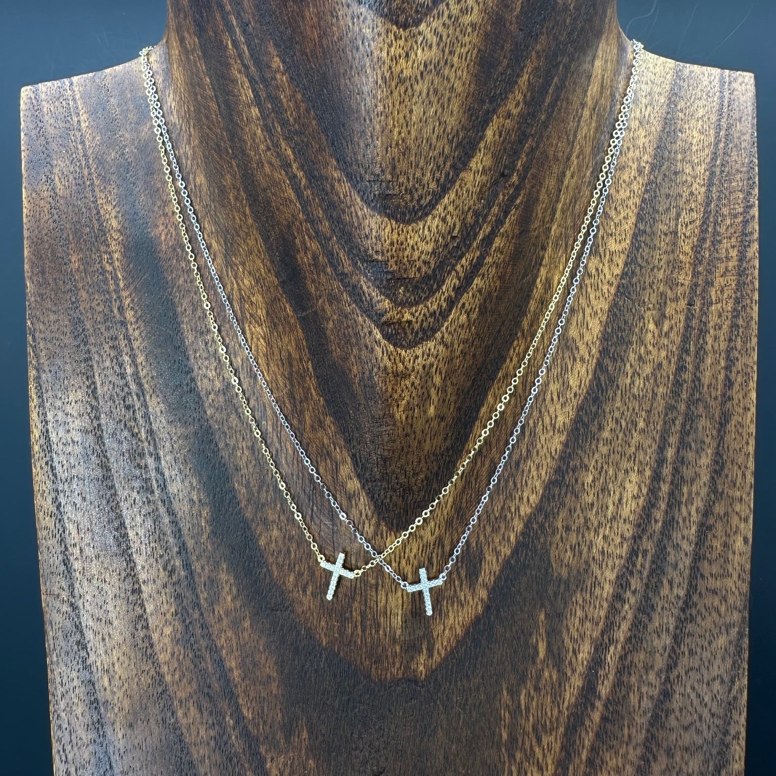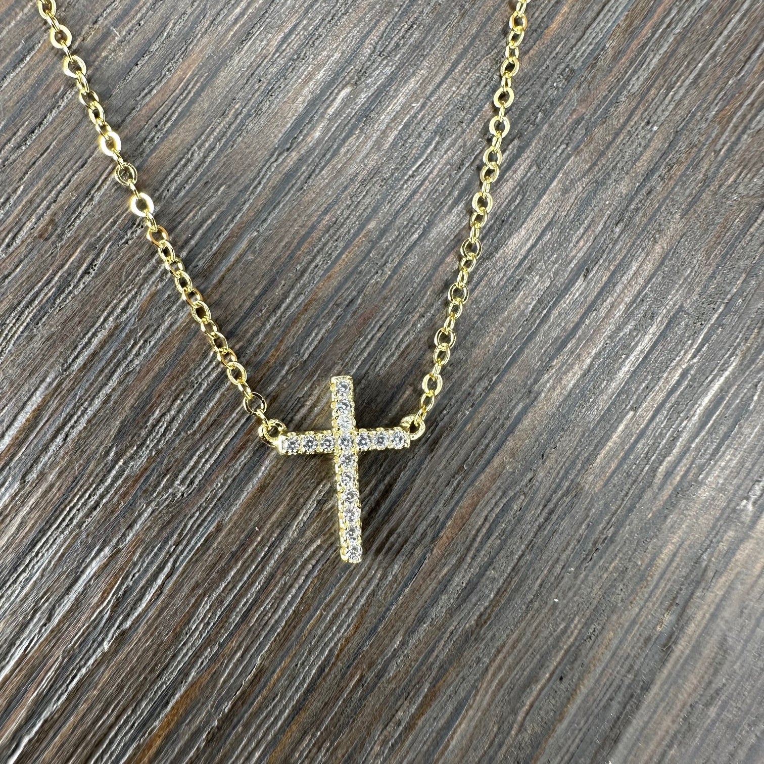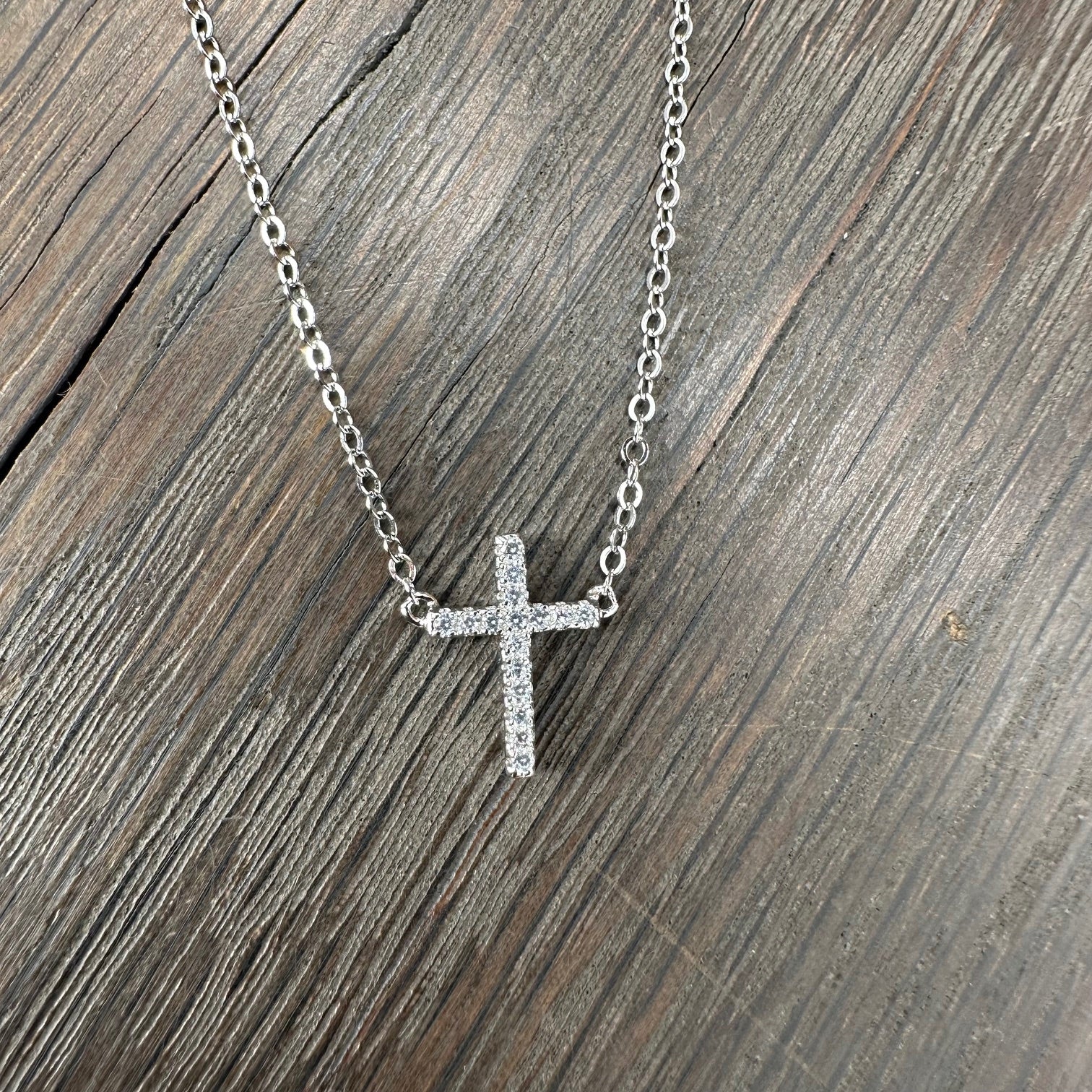 Tiny pavé cz cross necklace with horizontal orientation on dainty sterling based chain.