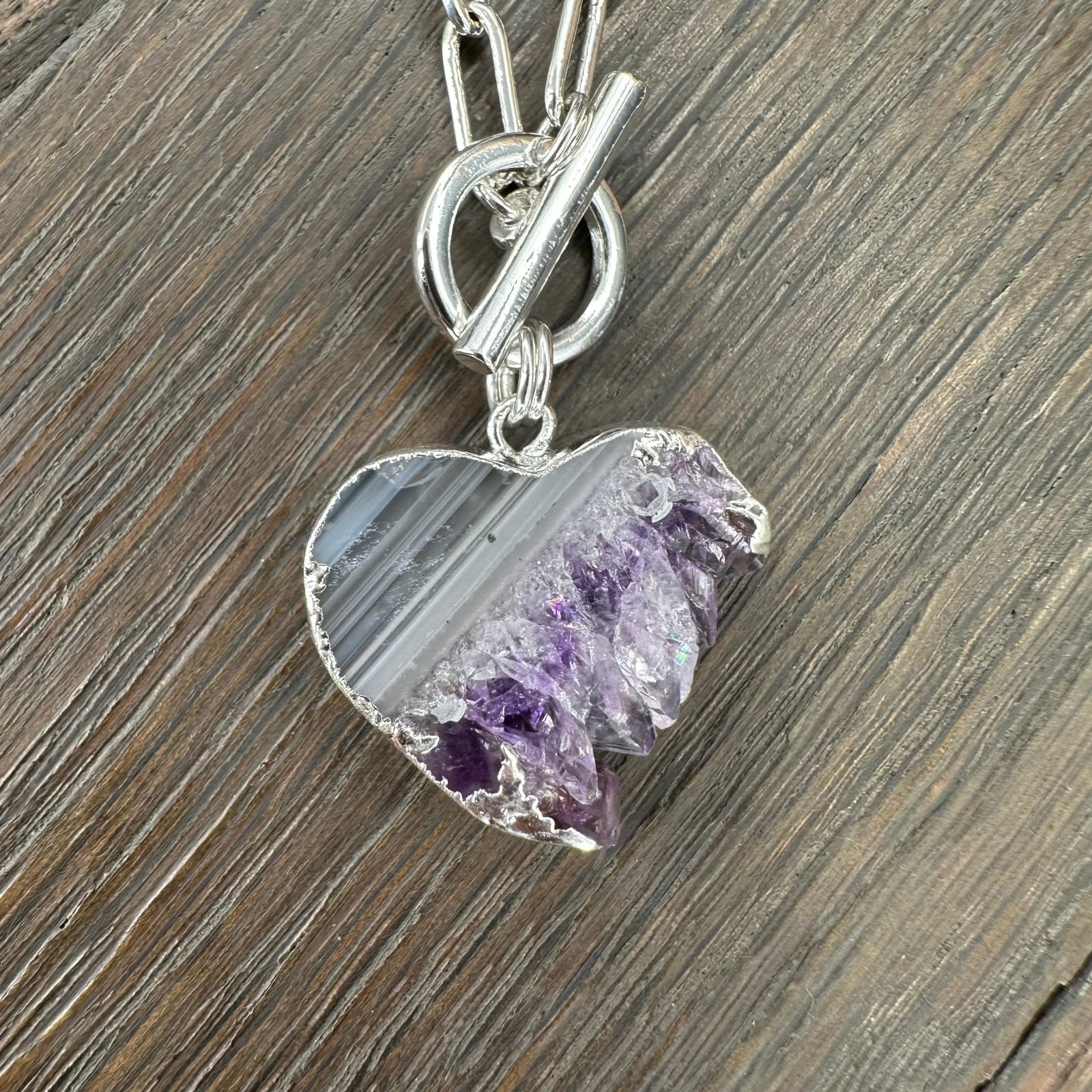 Gorgeous, asymmetrical crystal-edged heart with natural mineral stripes and striations in classic RPC "wrap and toggle" style. amazing natural beauty, on silver tone rectangle box chain.