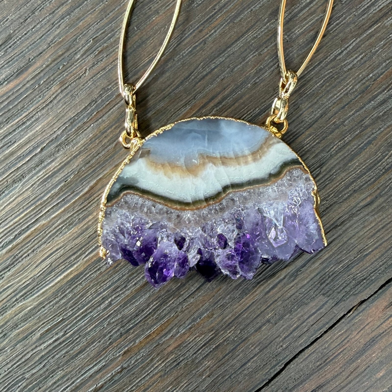 Metal marquis accents create unique negative space with stunning, half amethyst slice, crystal edged pendant.