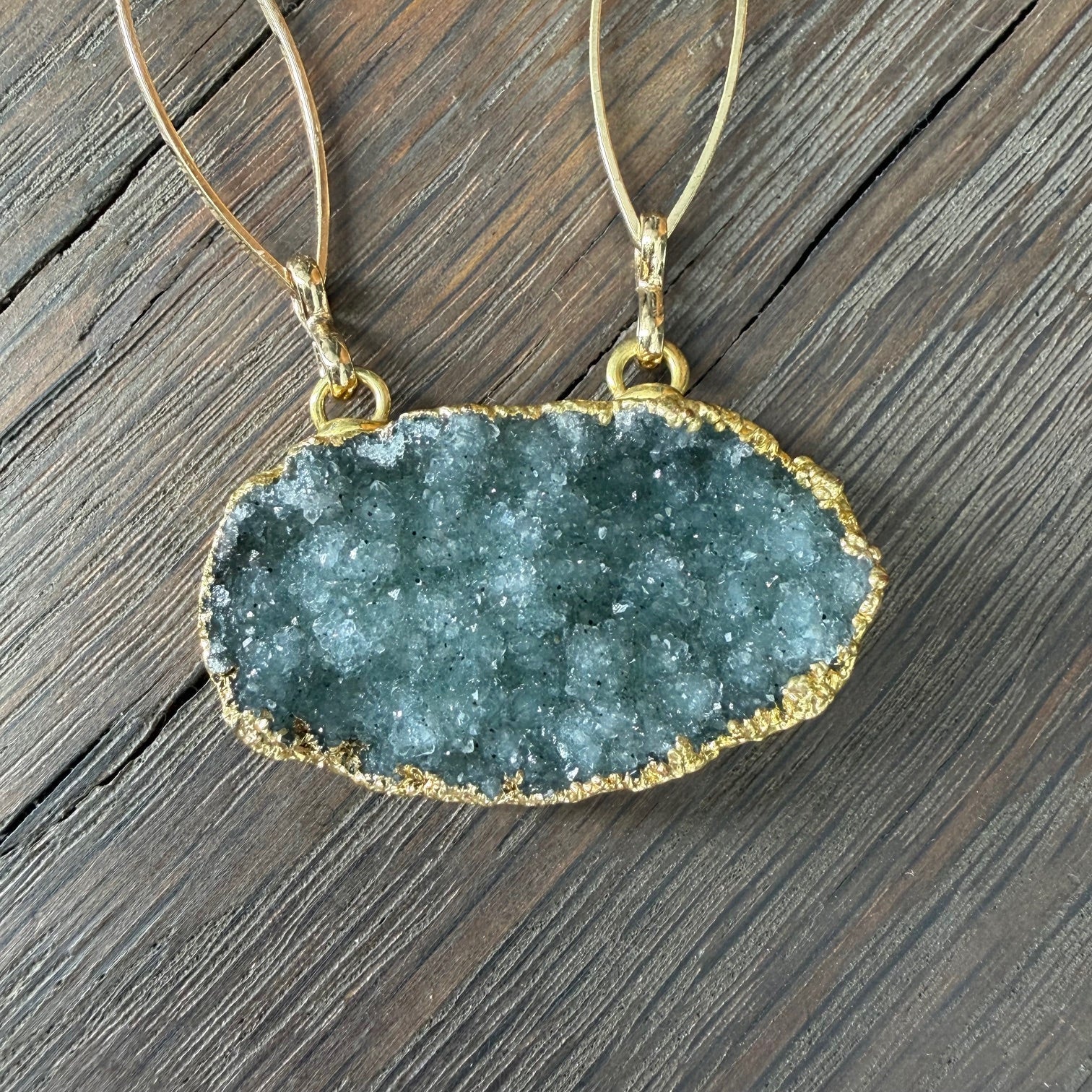 Metal marquis accents create unique negative space with sparkly, natural crystalline druzy disc pendant. Classic RPC.
