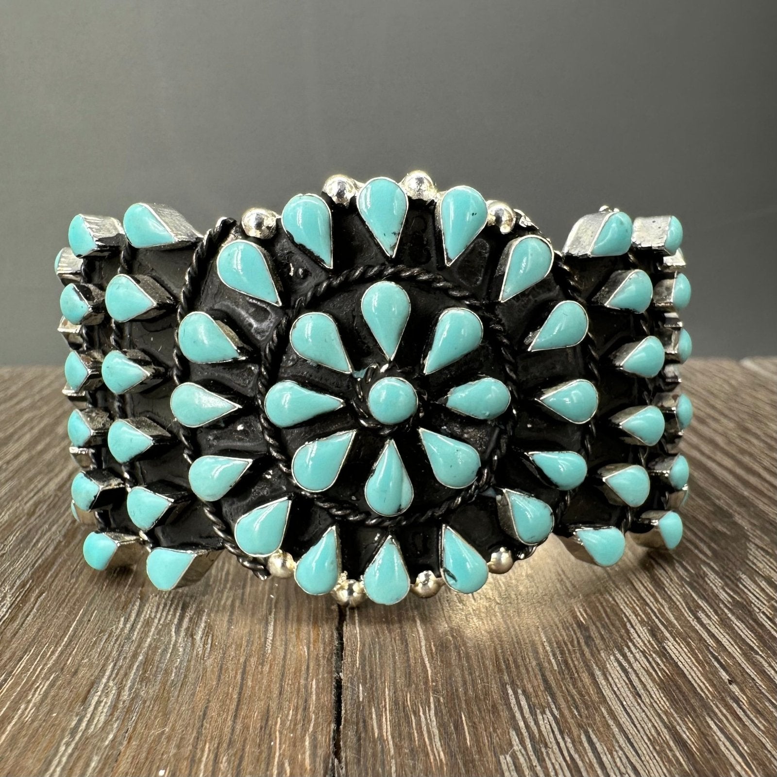 A dramatic and classic take in faux turquoise with this silver tone teardrop repeating howlite stones, in a fully adjustable silver tone cuff bracelet.