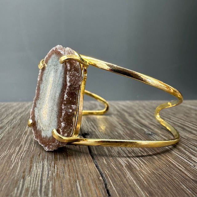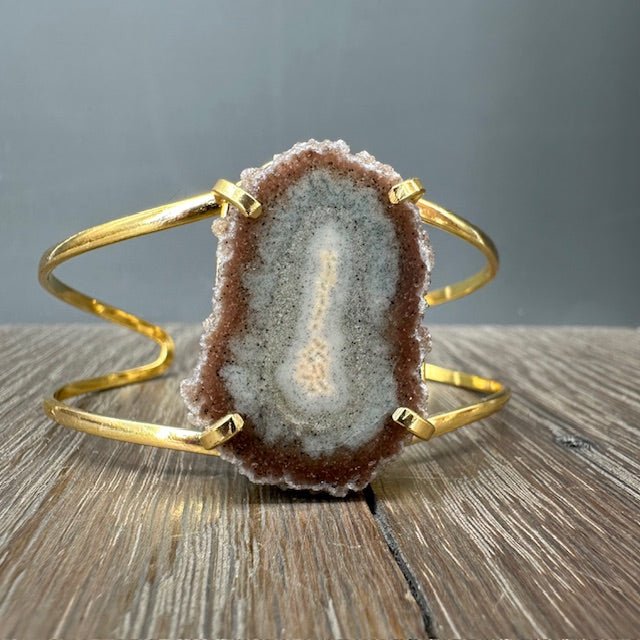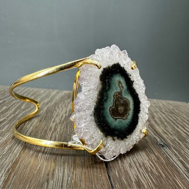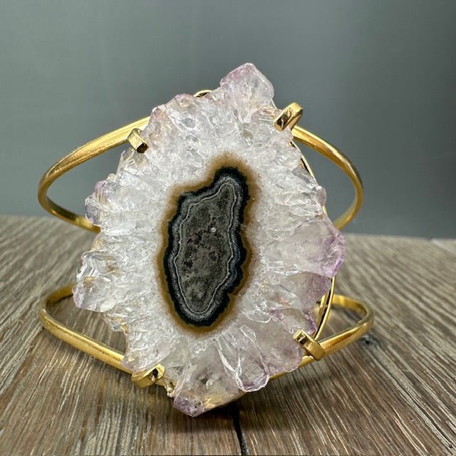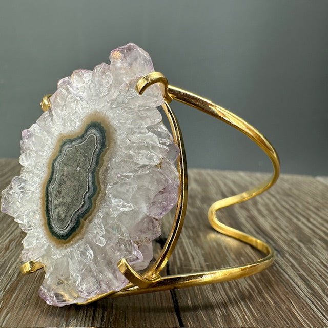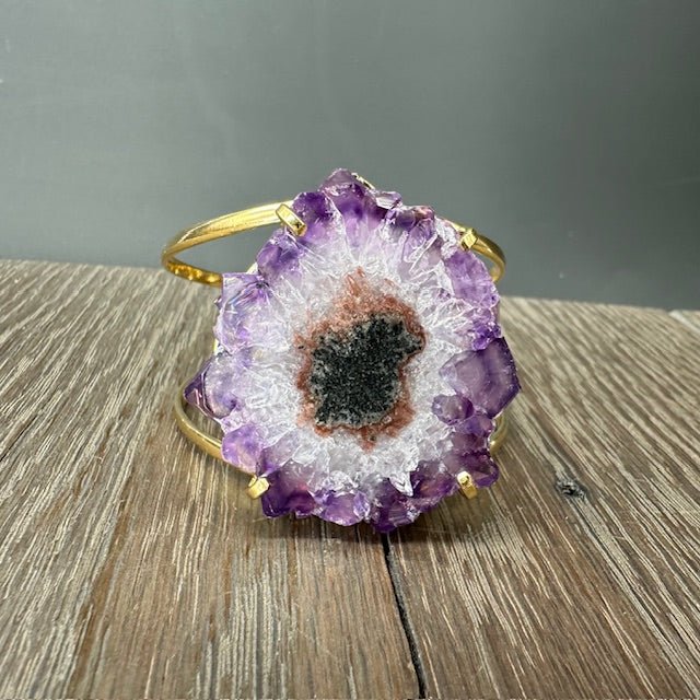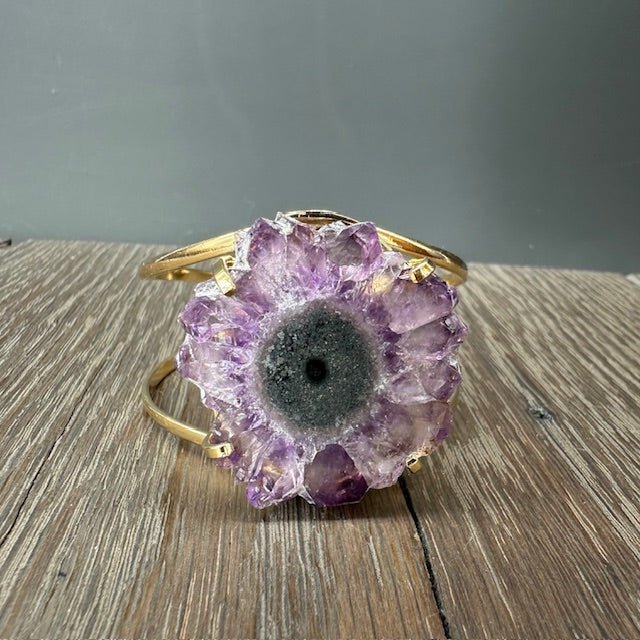 Absolutely stunning raw edged, crystal flower, and amethyst and Jasper. Select slices are cut from stalactites that grow for hundreds and thousands of years in caves and these gorgeous crystals are natural mineral formations. Wear the natural beauty of the earth right on your wrist.