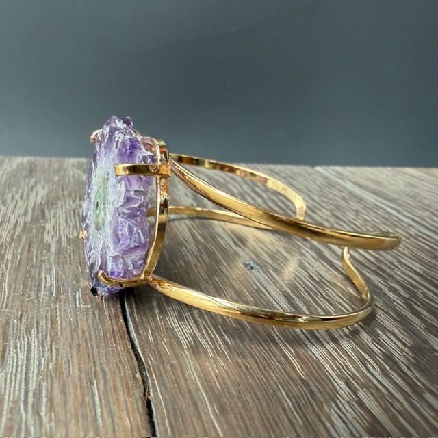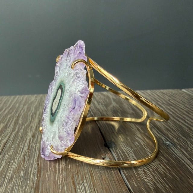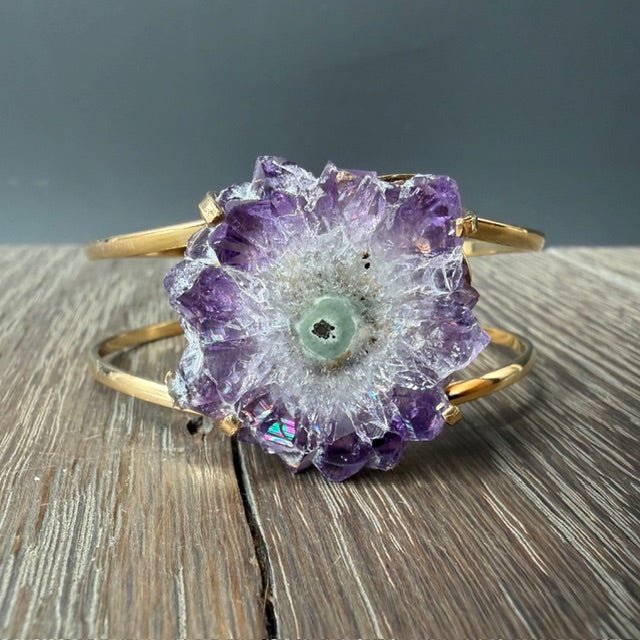 Absolutely stunning raw edged, crystal flower, and amethyst and Jasper. Select slices are cut from stalactites that grow for hundreds and thousands of years in caves and these gorgeous crystals are natural mineral formations. Wear the natural beauty of the earth right on your wrist.