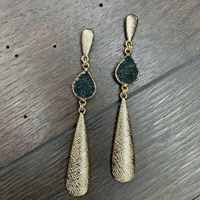 Lightweight and elegant, textured metal linear earring coordinate with the sparkly textured black druzy inserts.