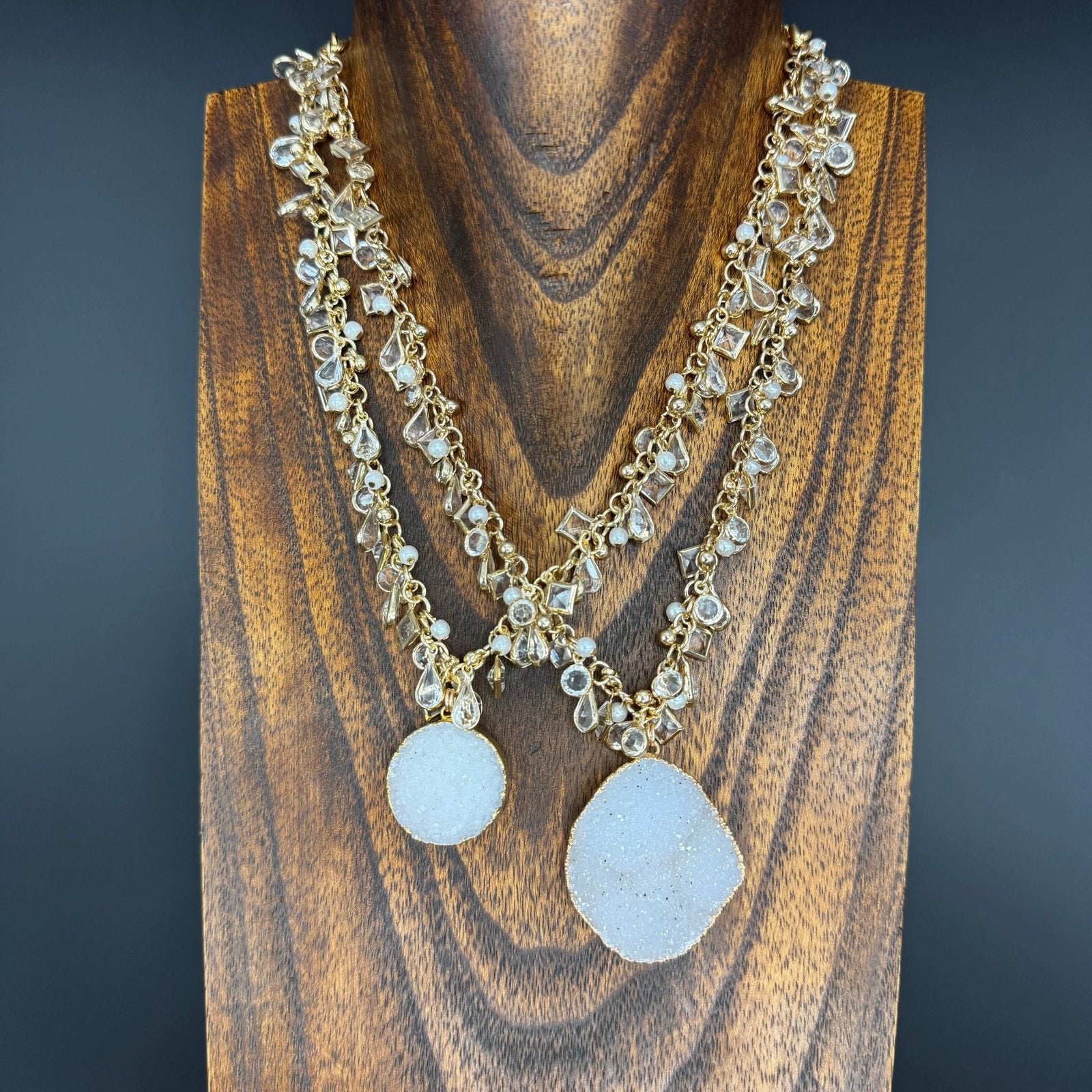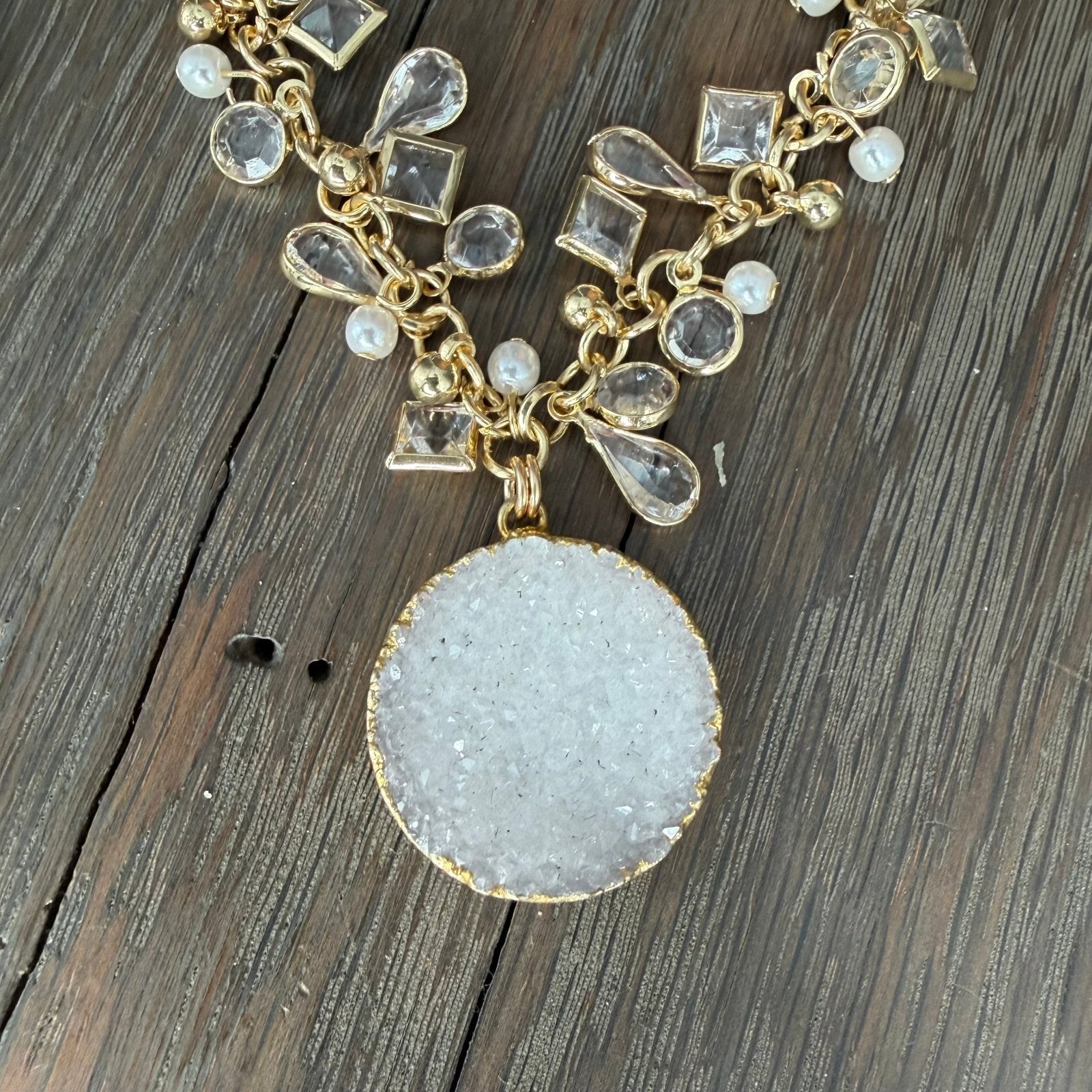 Sparkly, natural white druzy is stunning and here is a large freeform pendant and a small "full moon" pendant as well, both as a fun charm style with dangling faux pearls and geometric faceted accents.
