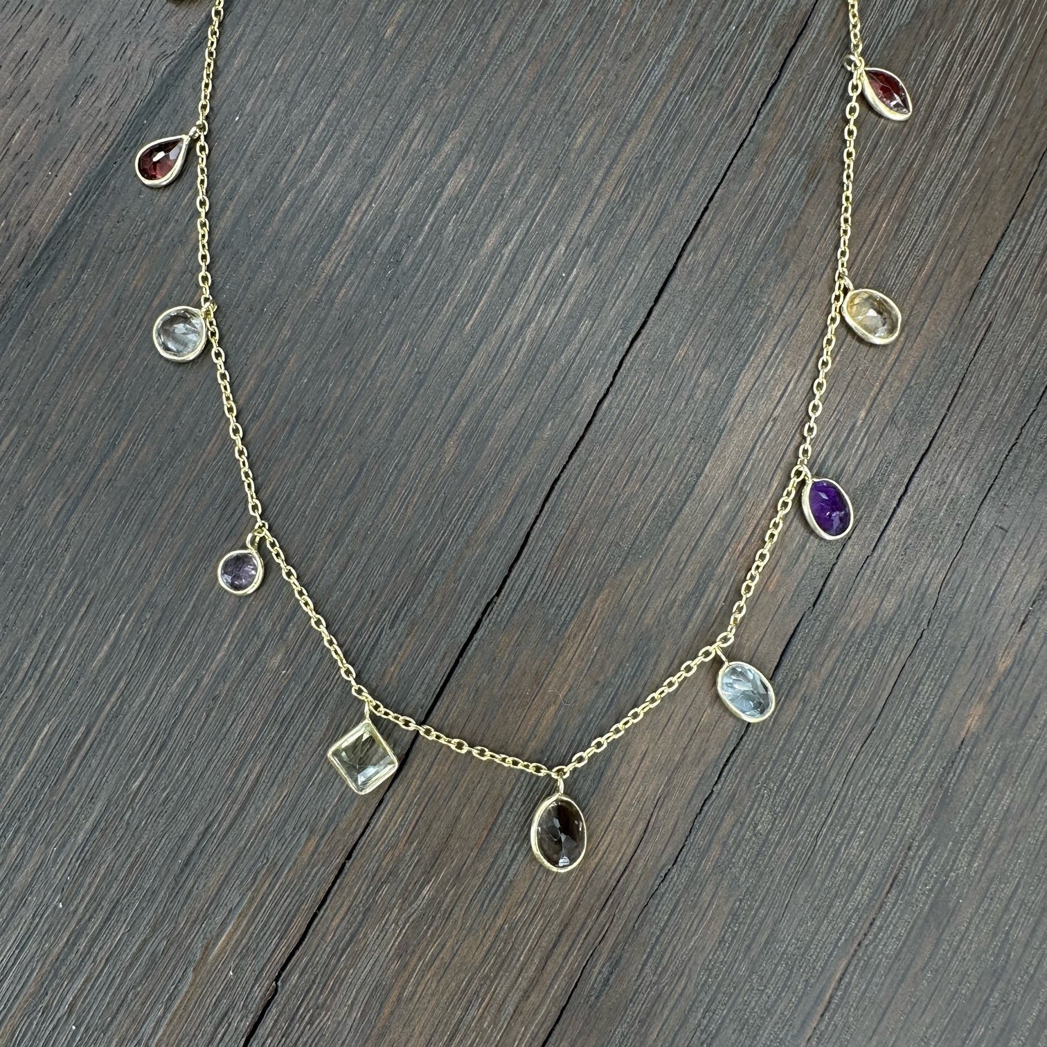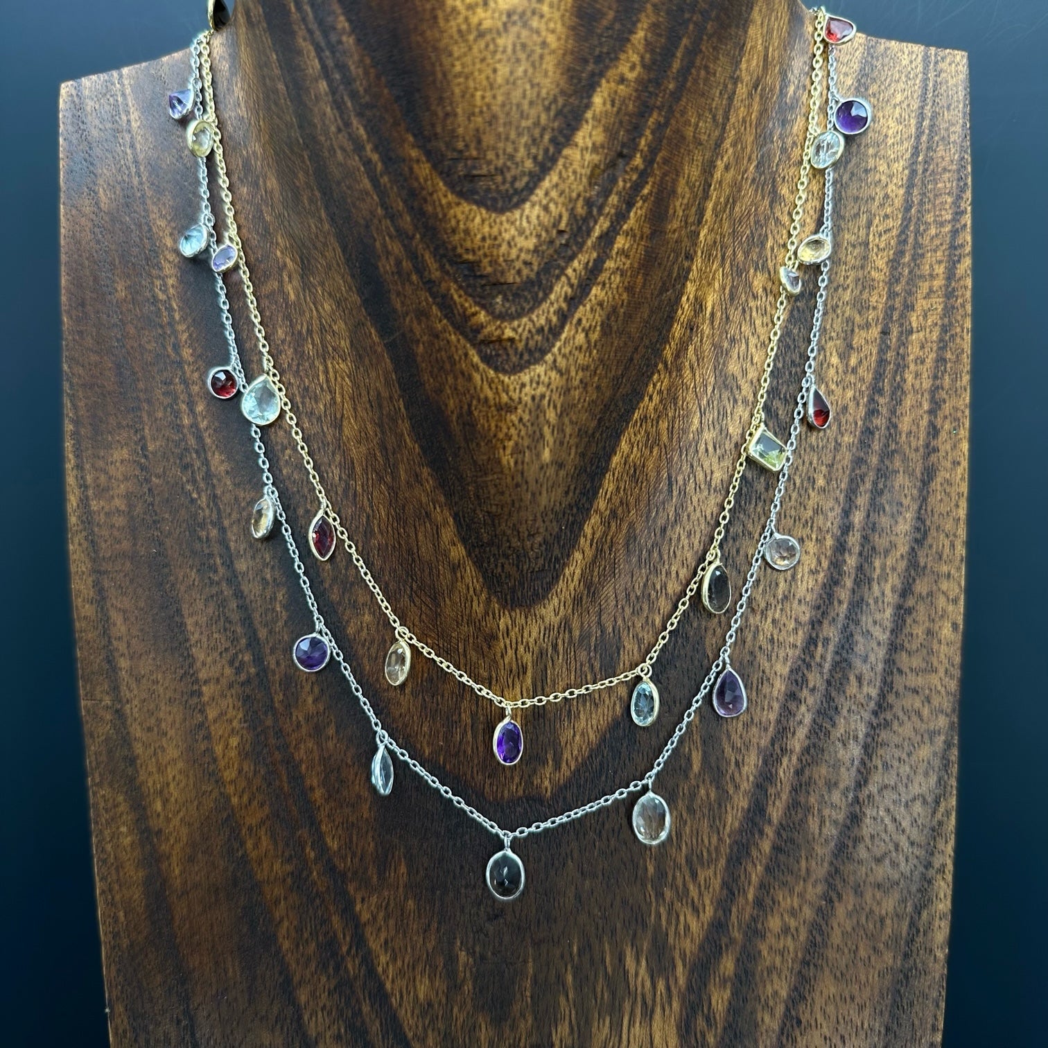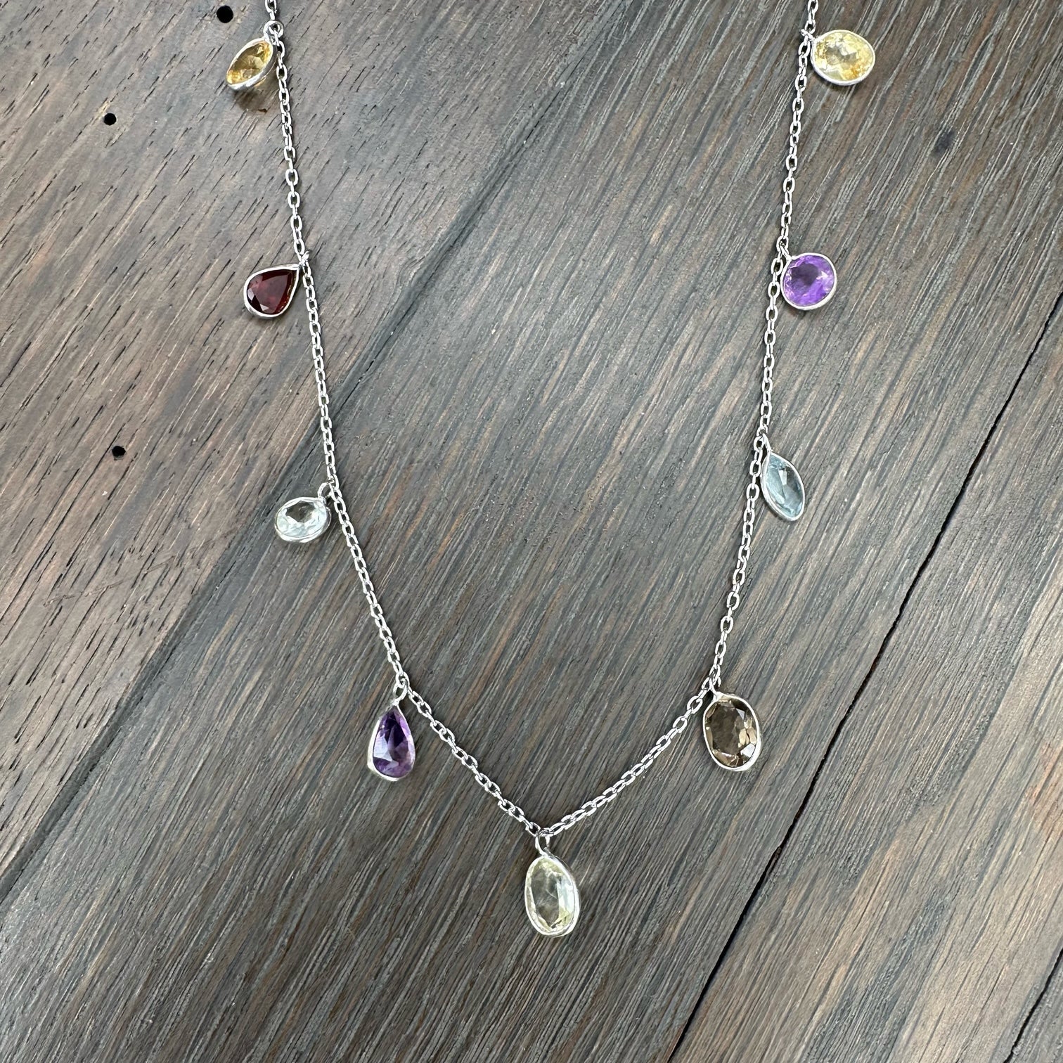Great for layering or worn alone, bezel-set, geometric faceted multi-colored czs on sterling silver based chain. Fun and rich!