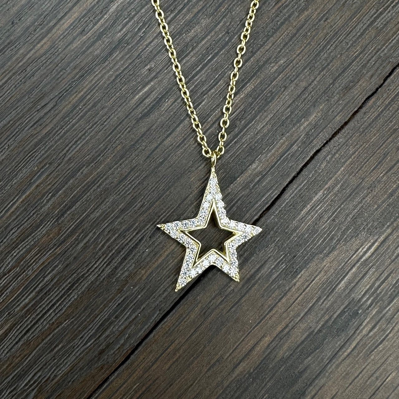 Pavé cz star necklace with interior metal trim on dainty chain.