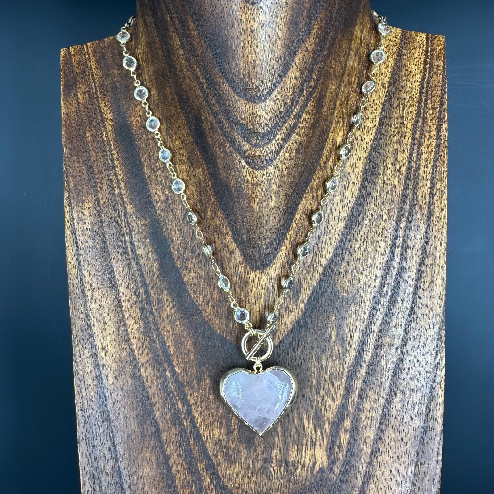 One of a kind gemstone heart pendant, bezel set in gold tone dipped toggle front accent clasp.