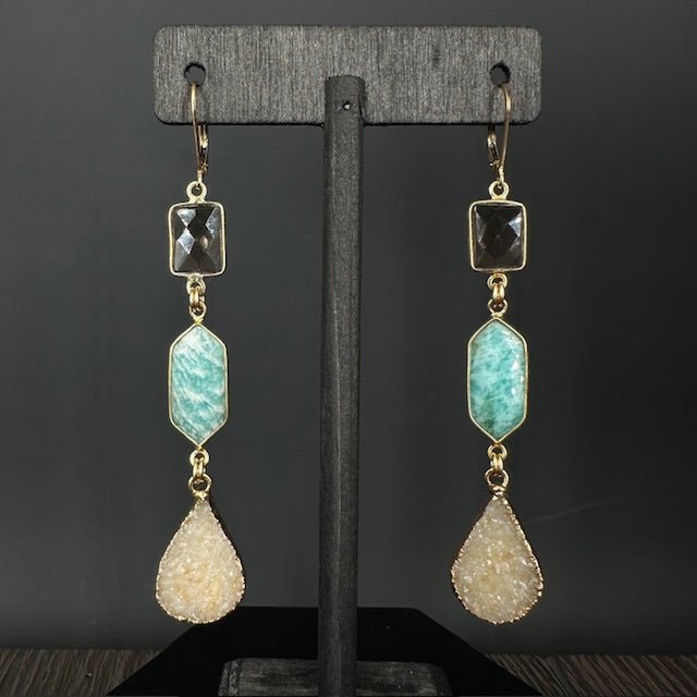 Oh so beachy and elegant, sparkly sand colored druzy paired with amazonite and faceted smoky quartz on gold filled lever backs.