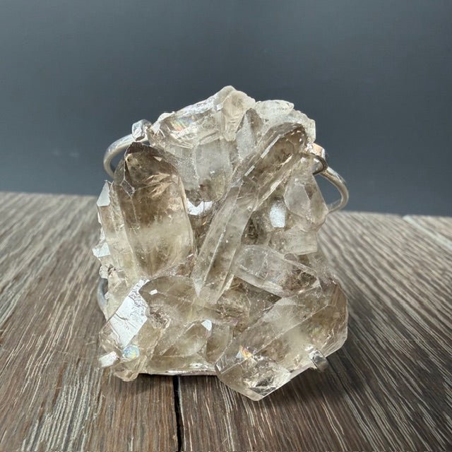 Naturally beautiful and just killer, smoky quartz, a grounding stone, assisting with calming negative emotions, prong set on adjustable cuff.