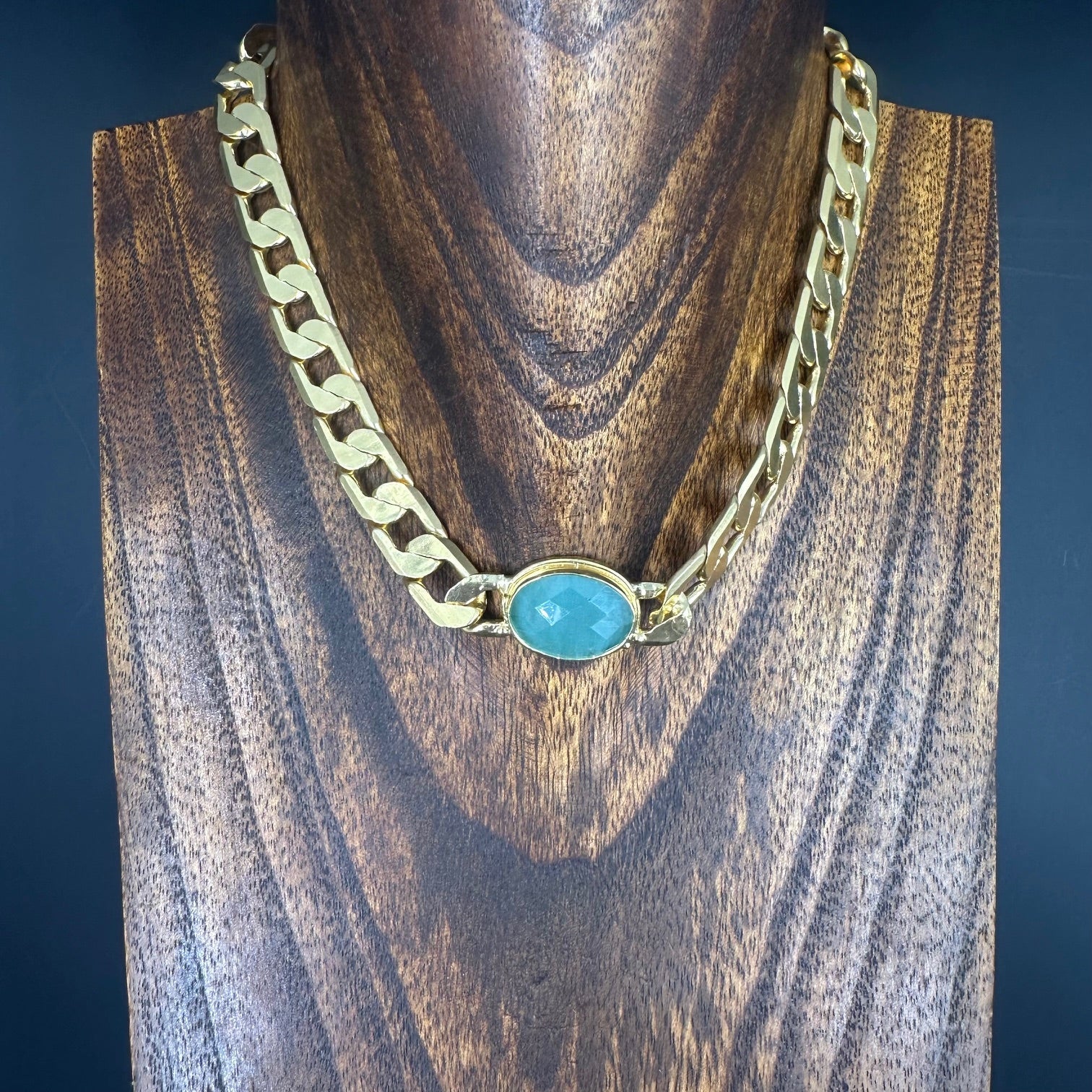 Elegant large curb chain necklace with bezel set chalcedony pendant.