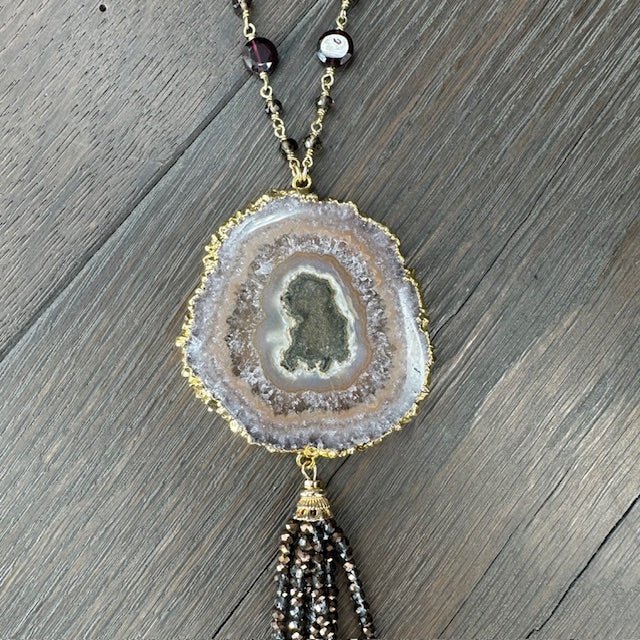 Smokey Quartz & Garnet Necklace with Stalactite Slice Pendent - gold tone