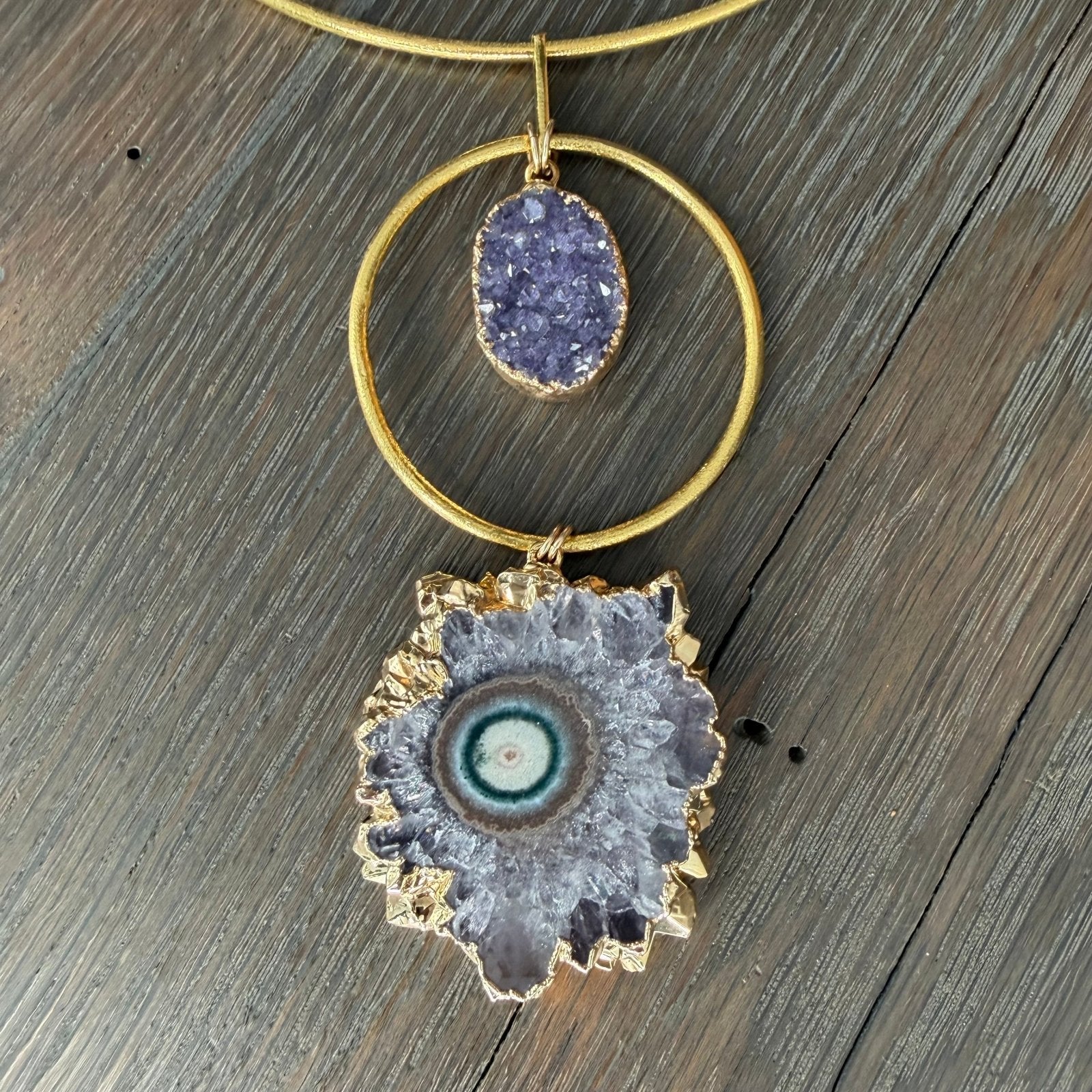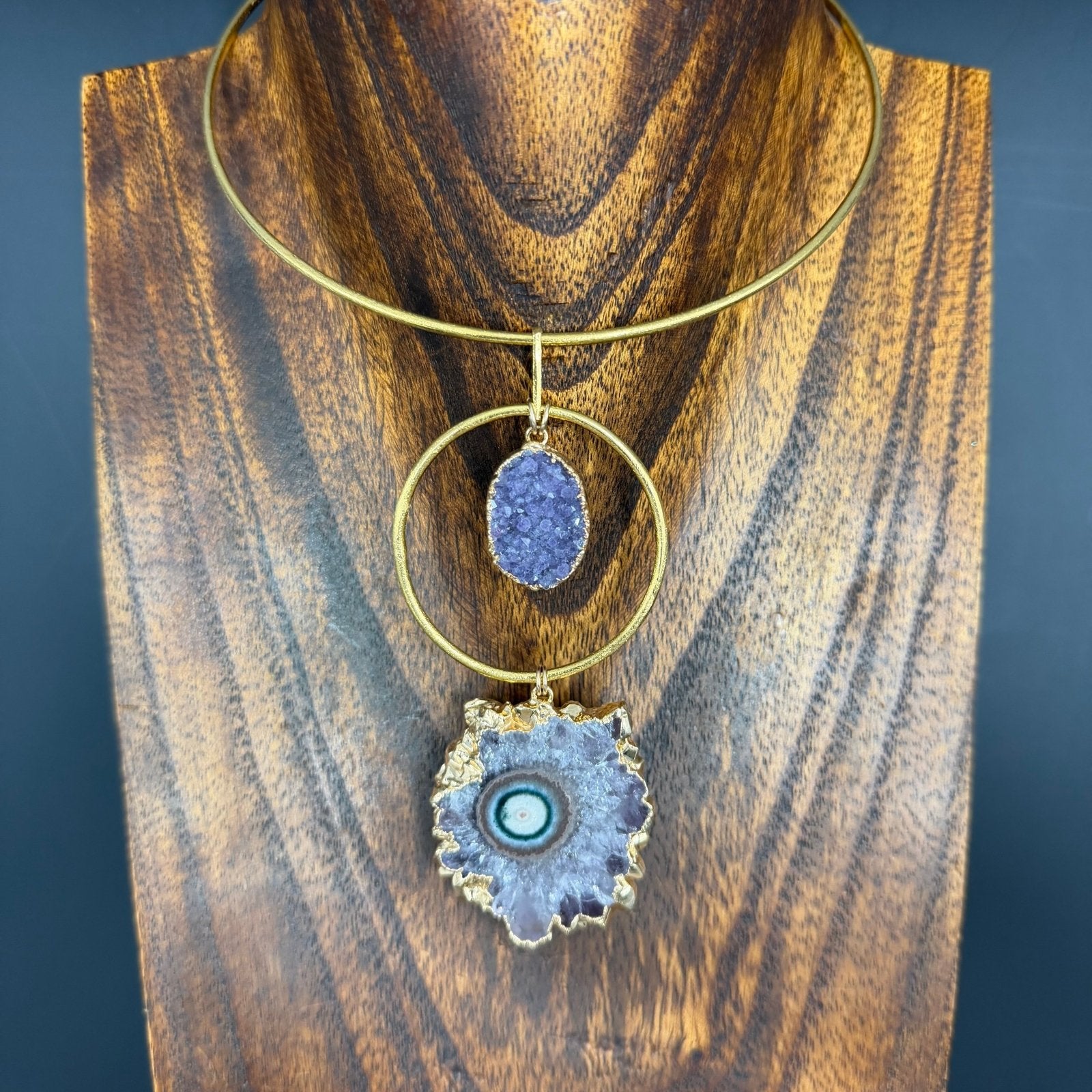Killer choker style necklace with brushed gold metal tubing and druzy dangle with coordinating, amethyst/jasper stalactite slice. Fully adjustable around the neck and as you choose for it to lay, great fashion- forward piece!